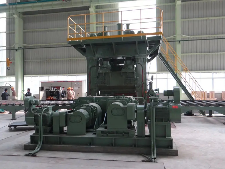 - 傳動裝置采用分流式主傳動技術(shù),多臺電機(jī)運轉(zhuǎn)帶動多根工作輻條轉(zhuǎn)動。進(jìn)出料軌跡由輥式矯平機(jī)控制臺控制,電動可逆,保證兩者運動速度相同。